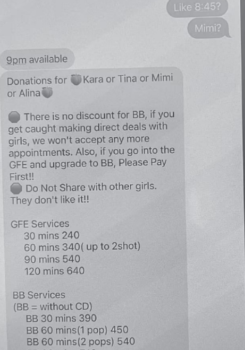 이들은 아시아계 여성들의 이름과 사진을 계속 업데이트하며 고객들이 원하는 여성을 고르도록 했다. 용의자들은 성 구매자들의 면허증과 추천인 등을 확인한 뒤 여성들이 거주하는 아파트 주소를 알려줬으며 시간당 최대 600달러의 ‘서비스 요금’을 받았다. 또한 단골 고객들은 매달 회비를 내고 정기적으로 성매매를 한 것으로 나타났다.