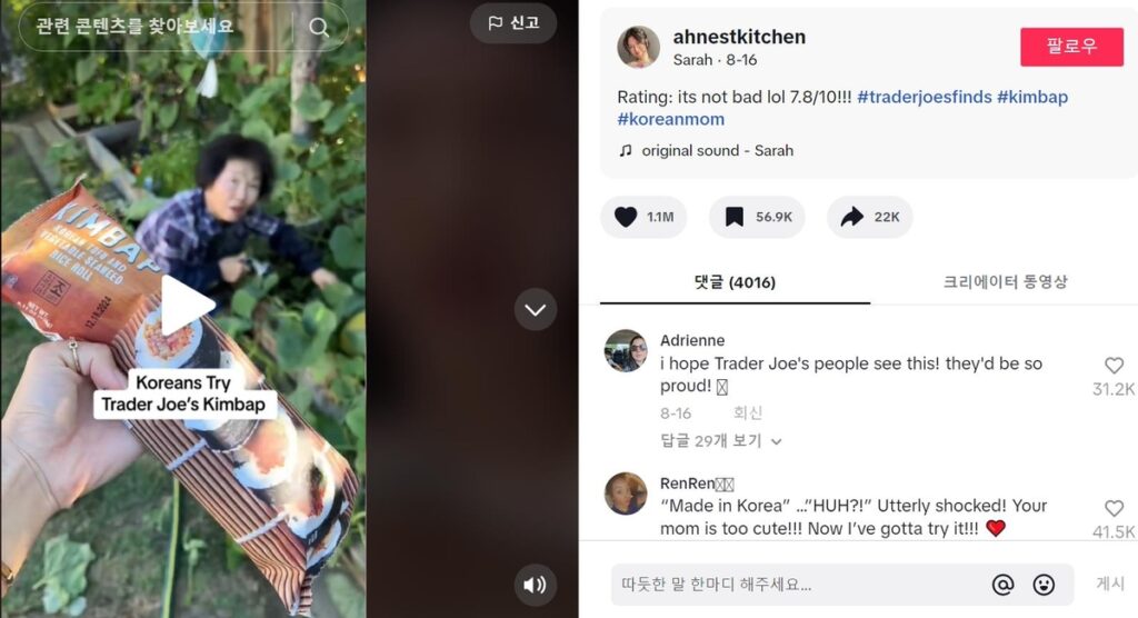 로스앤젤레스(LA) 옆 오렌지카운티에 사는 한인 음식 블로거 세라 안(27)이 어머니와 함께 이 김밥을 데워 함께 먹어보는 영상을 지난달 16일 틱톡에 올렸는데, 이 영상의 조회수는 1100만회를 넘었다.