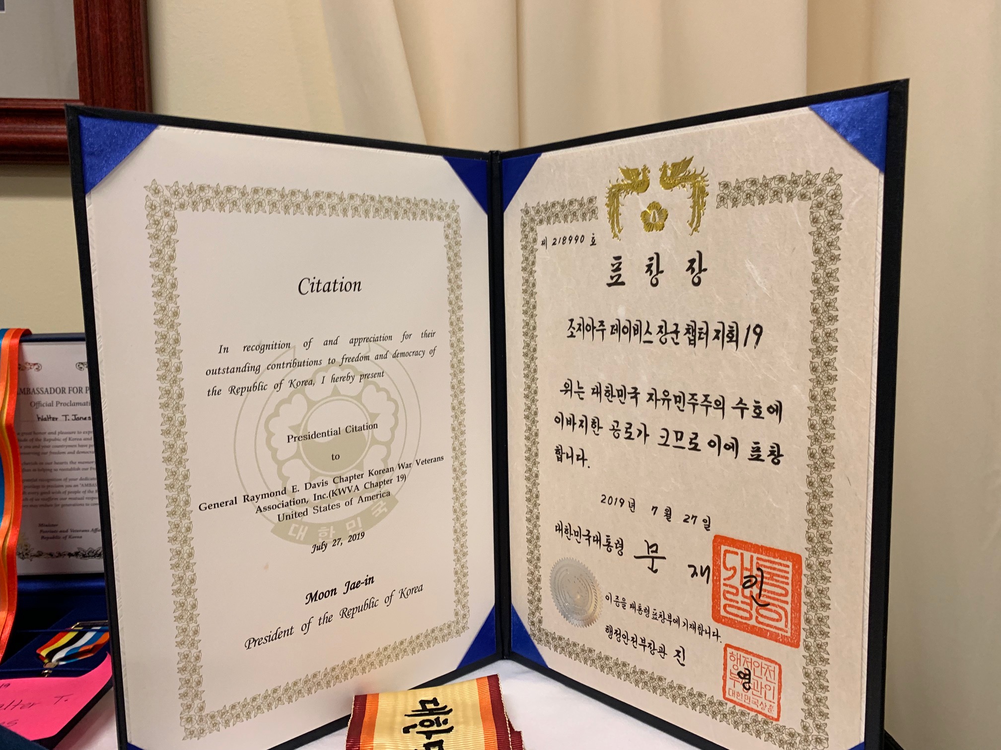 레이먼드 데이비스 챕터엔 문재인 대통령 표창장 전달