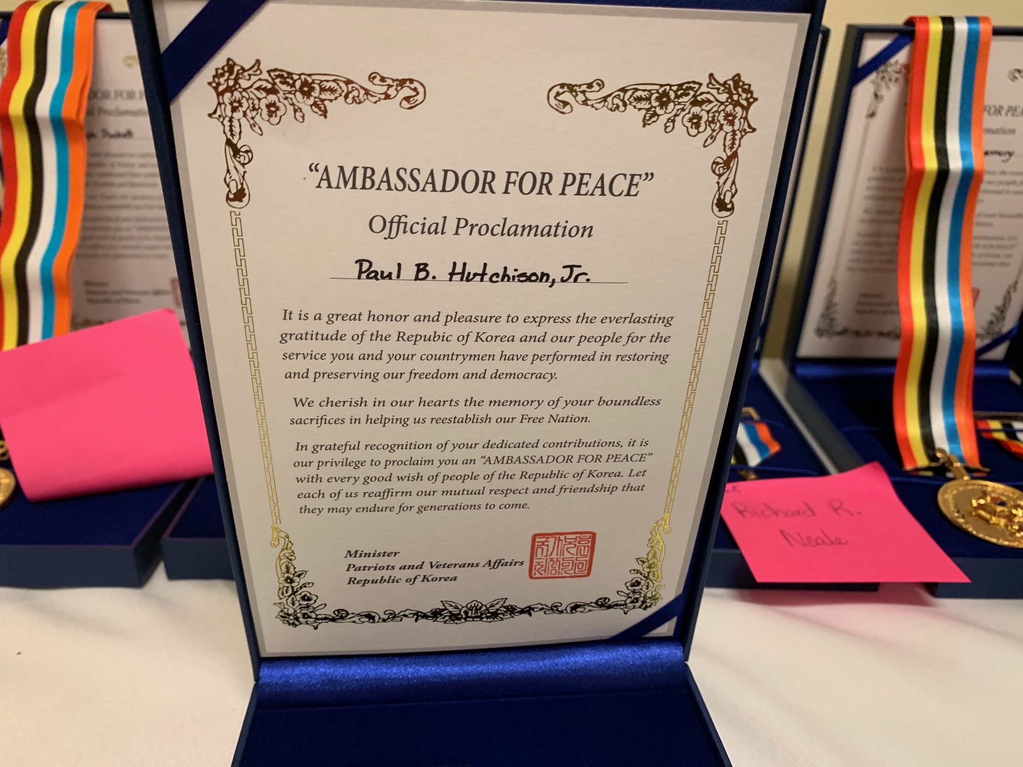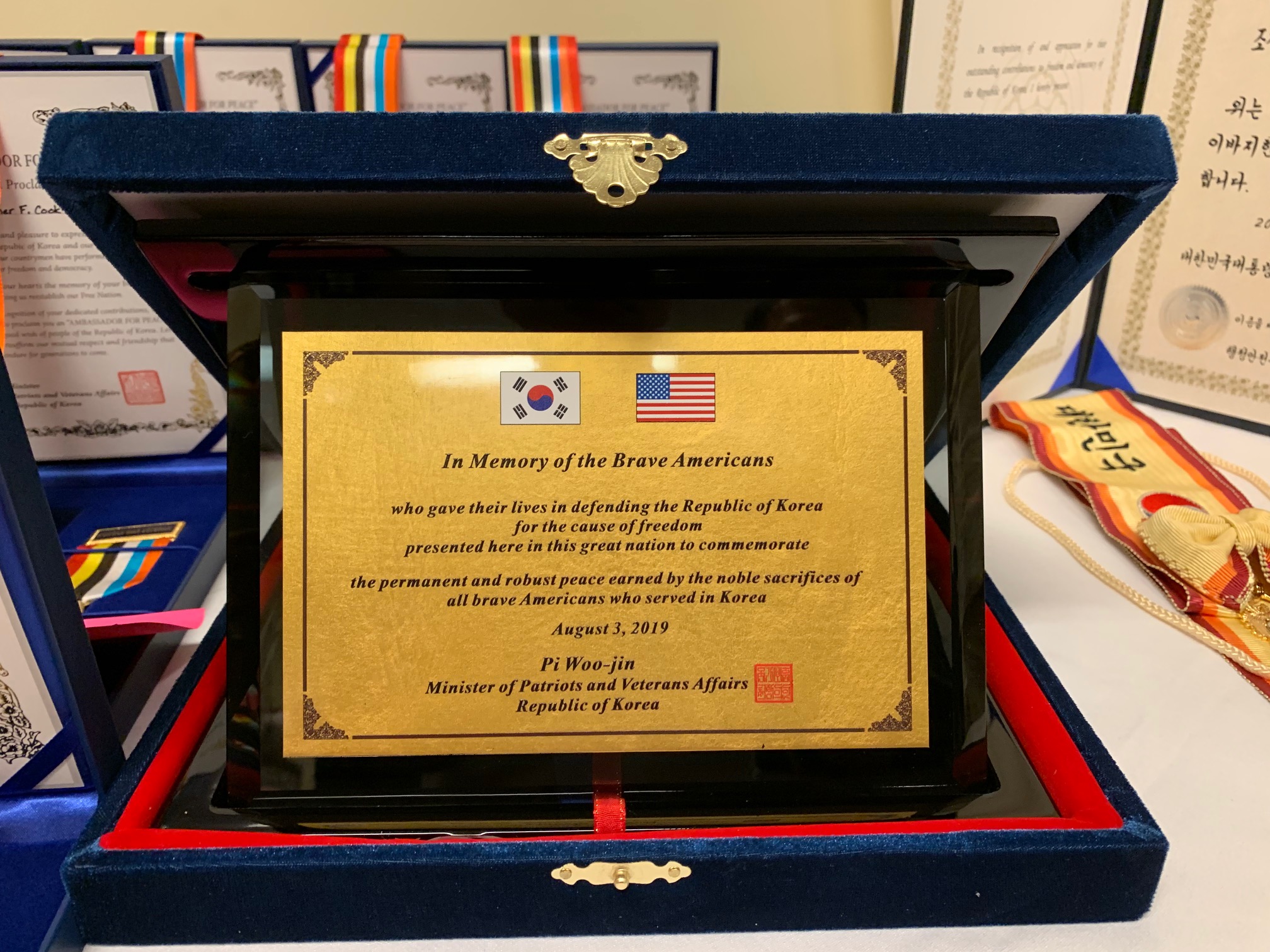 이병구 차장은 연설후 미 한국전 참전용사회(KWVA)의 제19지구인 레이먼드 데이비스 챕터 노만 보드 회장에게 대통령 표창장을 전달했다.