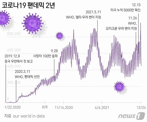 블룸버그 통신은 자체 집계를 통해 전일 기준 전 세계 하루 신규 확진자 수가 144만 명에 달했다고 보도했다. 주간 하루 평균 확진자 수는 84만1000명으로, 오미크론이 발견된 한 달 사이 49% 증가했다.