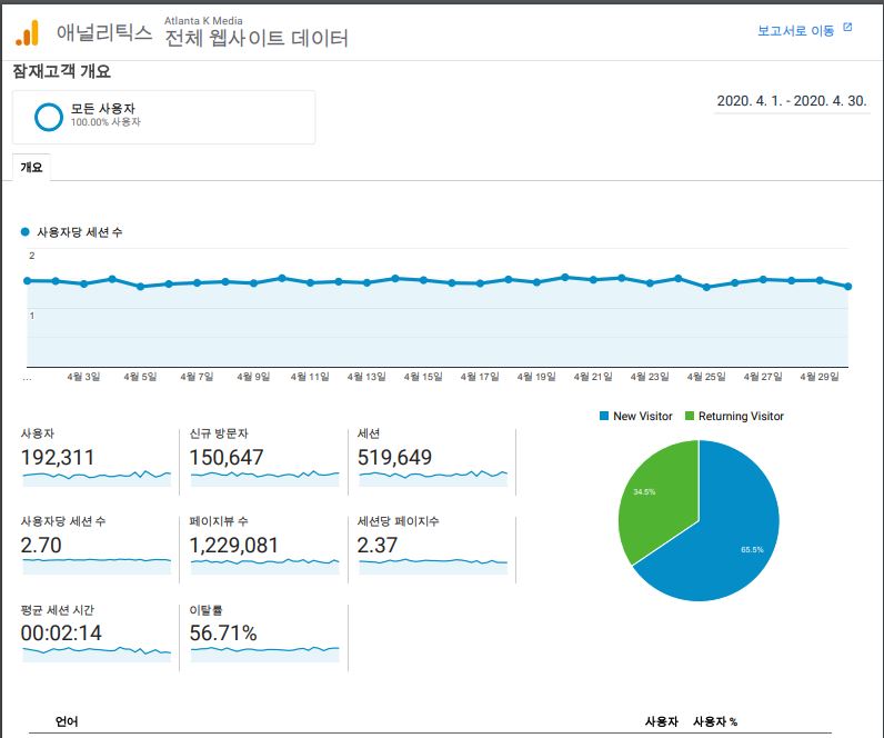 애틀랜타K 뉴스 2020년 4월 구글 애널리틱스 통계입니다.