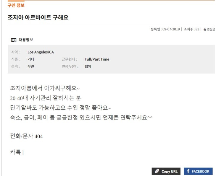 이 게시물에는 “숙소와 급여 등에 궁금한 점이 있으면 언제든지 연락해 달라”며 전화와 카톡연락처도 소개돼 있다. 동종 업계 관계자는 기자에게 “한국에서 방문하는 여성들이 많은 LA 지역에서 종업원을 구하기 위해 가끔 그쪽 일간신문 웹사이트 게시판에 광고를 올리기는 한다”면서 “하지만 그 내용이 뉴스에 나올 줄은 몰랐다”며 실소했다.