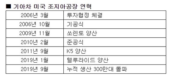 해 미국 자동차시장이 위축된 가운데에서도, 올해 10월까지 51만3,605대를 판매해 전년 동기 대비 3.3% 성장세를 보이고 있다. 이 중 조지아공장에서 생산되는 K5, 쏘렌토, 텔루라이드 3개 차종이 40% 이상을 차지하고 있다.