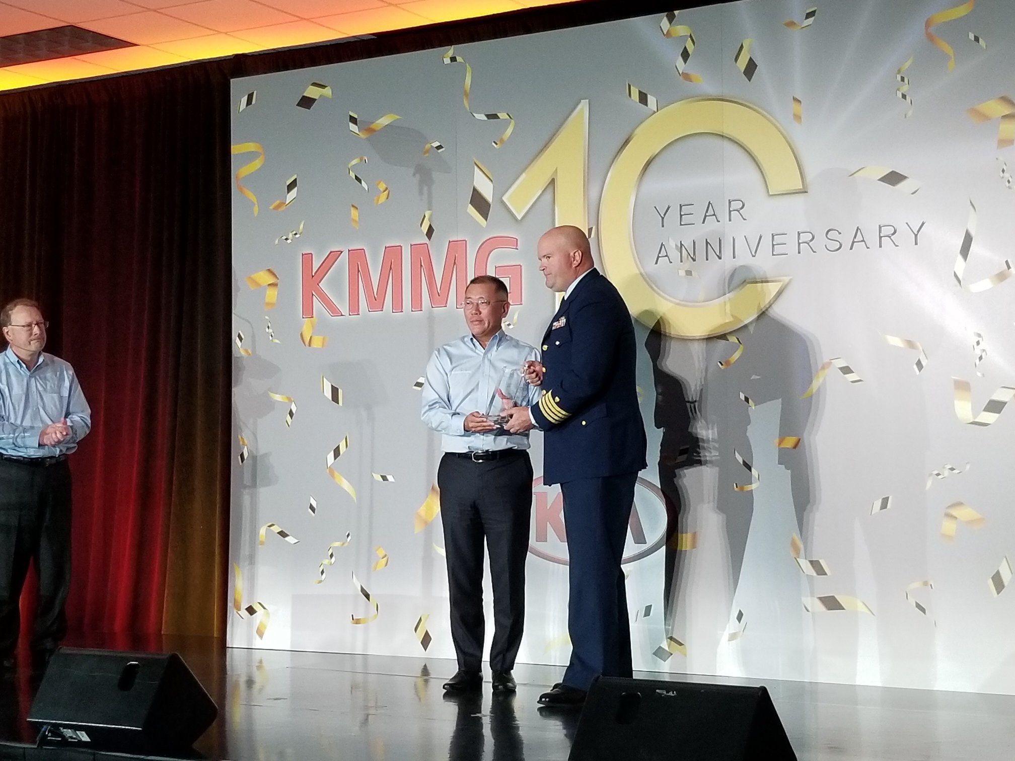 기아차는 18일 조지아주 웨스트포인트에 위치한 조지아공장에서, 양산 10주년 기념행사를 열었다. 사진은 행사에 참석한 브라이언 켐프 조지아주 주지사(왼쪽), 정의선 현대자동차그룹 수석부회장. (기아차 제공)