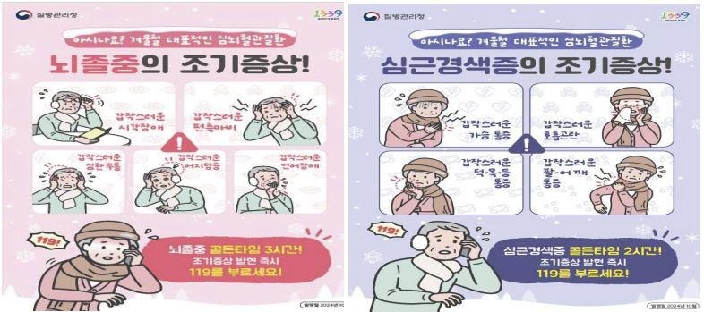 한국 질병관리청은 20일 설 연휴를 앞두고 추위가 지속함에 따라 본인이나 가족에게 이러한 뇌졸중, 심근경색 조기 증상이 나타나면 바로 119에 연락해 적절한 치료를 받아야 한다고 당부했다.