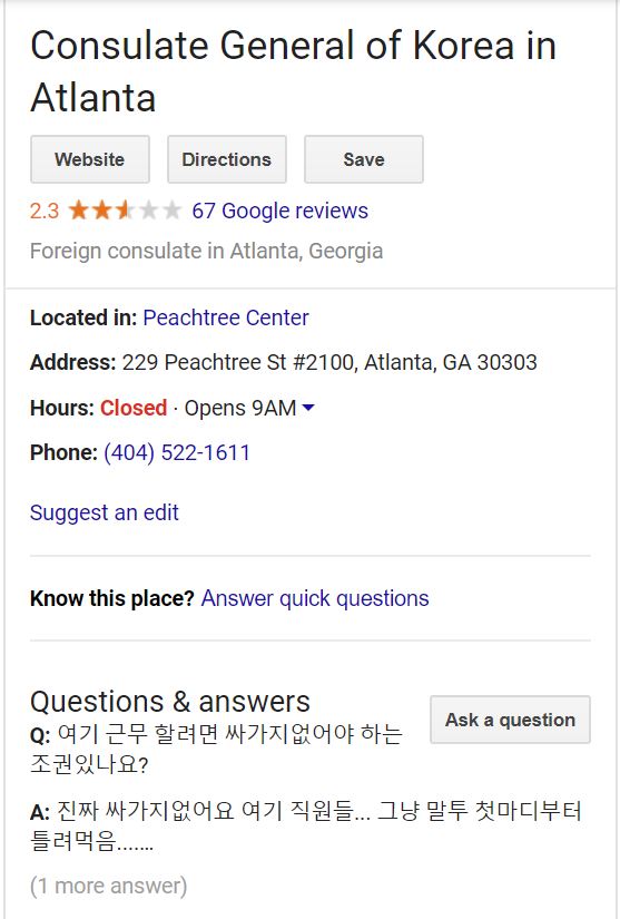 비즈니스 뿐만 아니라 공공기관이나 일반단체에도 이러한 페이지가 만들어집니다. 동남부에서 대한민국 정부를 대표하고 있는 애틀랜타총영사관도 구글 페이지가 있습니다. 그 페이지에서 가장 눈길을 끄는 것도 한 이용자가 올린 질문과 다른 분의 답변입니다. 그 내용은 창피하게도 “여기(총영사관에) 근무하려면 O가지없어야 하는 조건있나요?”와 “진짜 O가지없어요 여기 직원들… 그냥 말투 첫마디부터 틀려먹음”입니다.
