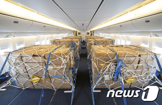 코로나19 화이자 백신을 실은 대한항공 화물기에서 하역작업이 진행되고 있다. |