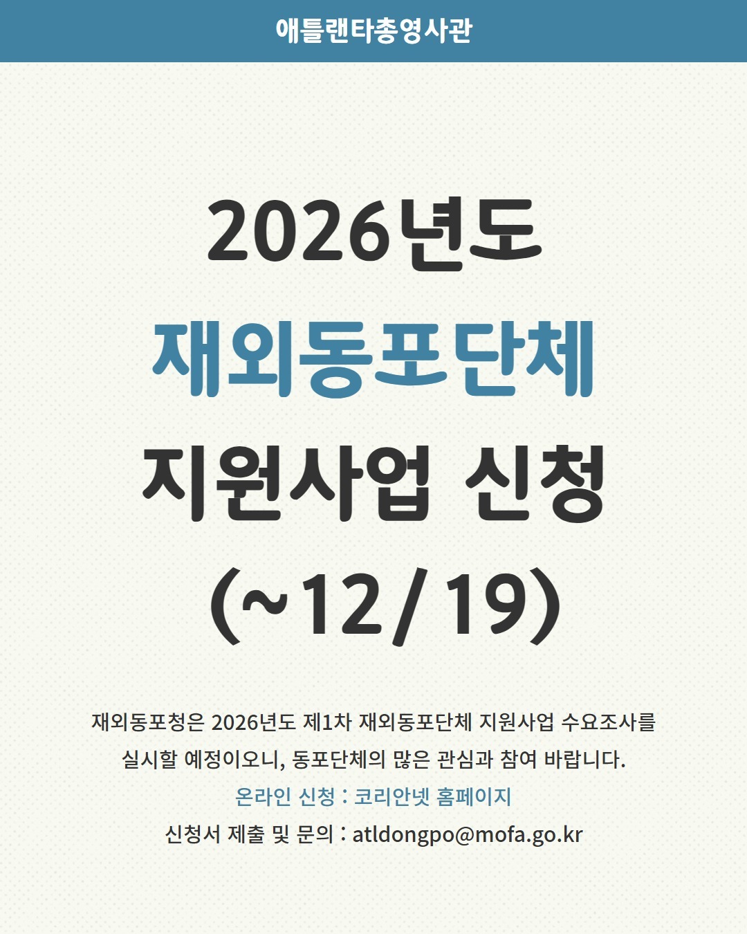 재외동포청이 2026년도 재외동포단체 지원사업을 위한 수요조사를 오는 12월 19일까지 진행한다.