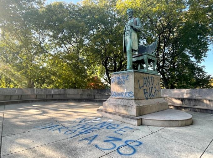 동상 어깨에 붉은색 페인트가 뿌려졌고 동상 받침대에 ‘식민주의자들을 퇴출하라’, ‘원주민 땅을 다시 원주민에게’ 등의 구호와 함께 바닥에 ‘다코타 원주민 38명을 위한 복수’라는 문구가 낙서됐다.