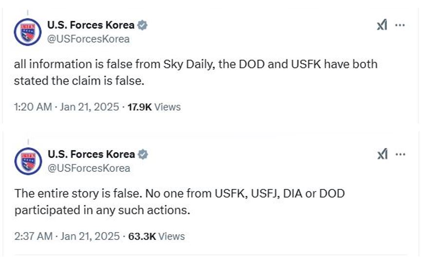 하지만 일부 윤석열 대통령 지지자들이 “주한미군을 인용한 한국 언론들의 보도가 오히려 가짜뉴스 아니냐”고 문의하자 주한미군은 답글을 통해 매체명을 적시하며 “스카이데일리의 모든 정보는 거짓이며 국방부와 주한미군 모두 해당 주장이 거짓이라고 밝힌 바 있다”고 답변했다.