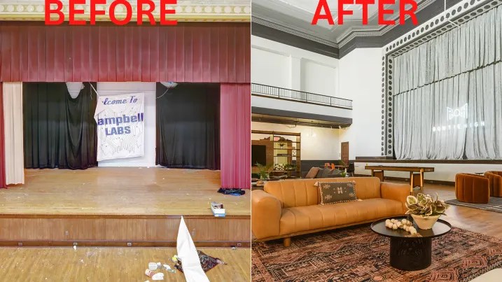 이전 고등학교 교실은 세탁기와 건조기가 있는 새롭고 현대적인 아파트로 변신했다. 강당은 전문 디자이너의 손길을 거친 공유 공간으로 재탄생했고 1층에는 농구 코트와 펠로톤 자전거가 있는 체육관이 추가됐다.