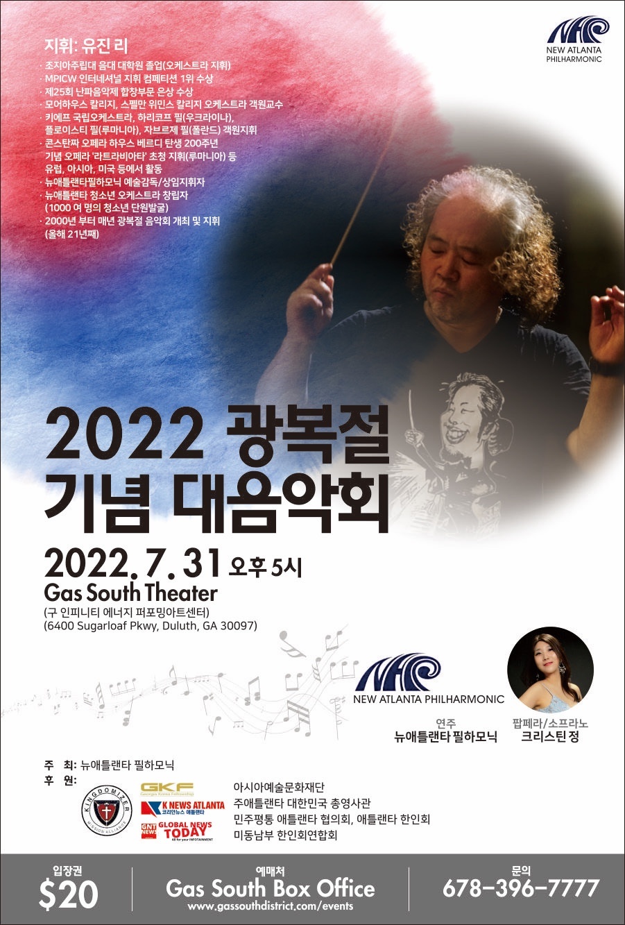 오는 31일(일) 오후 5시 개스사우스 시어터(Gas South Theater)에서 열리는 2022 광복절 기념 대음악회 “우리는 모두 하나(We’re all one)”가 유진 리 지휘자의 지휘로 무대에 오른다.