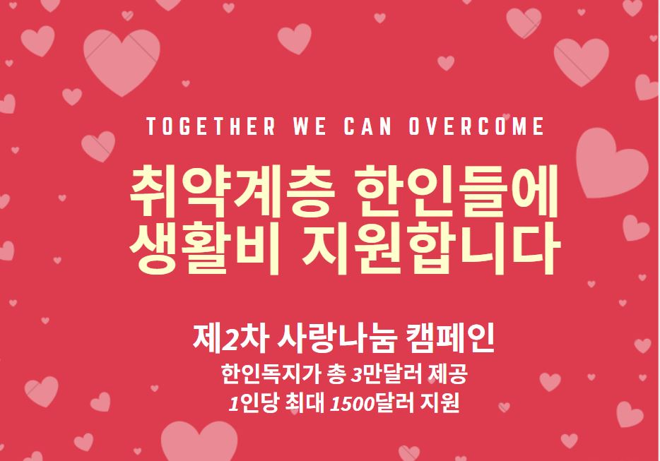 전례없는 경제위기가 미주 한인사회를 휩쓸고 있지만 사랑과 온정을 나누면 이 위기를 함께 극복할 수 있습니다. 코로나 바이러스의 전염력보다 훨씬 강력한 한인사회의 사랑과 선행의 전파력에 감사드리며 한인 여러분의 많은 지원 바랍니다.