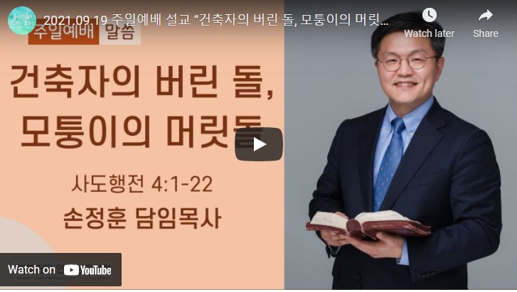 [설교 동영상] 건축자의 버린 돌, 모퉁이의 머릿돌 admin 4 years ago 주일예배 “건축자의 버린 돌, 모퉁이의 머릿돌” (행 4:1-22) 아틀란타 연합장로교회 손정훈 담임목사 2021.09.19 아틀란타 연합장로교회는 영유아부 부터 시니어 사역에 이르기까지 남녀노소 세대간격을 뛰어넘어 한마음 한뜻으로 하나님을 섬기는 성경적 문화를 만들어 가고 있습니다. 삼대가 함께 섬기는 교회, 아틀란타 연합장로교회의 비전입니다.