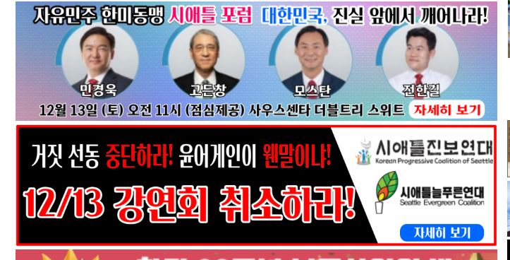 이에 대해 시애틀의 한 한인 언론인은 “보수단체의 집회는 하와이에 거주하는 ‘윤어게인’ 핵심 지지자 애니 첸씨가 지원하는 것으로 알고 있다”면서 “미국 한인사회가 한국 정치 성향을 놓고 분열하기 보다는 협력과 통합에 무게를 둬야 한다”고 말했다.