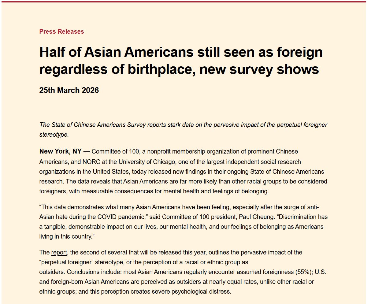 시카고대 산하 연구기관 100인위원회와 전국여론조사센터가 공동으로 실시해 25일 발표한 조사에 따르면, 아시아계 응답자의 55%가 일상에서 외국인으로 인식되는 경험을 했다고 답했다.