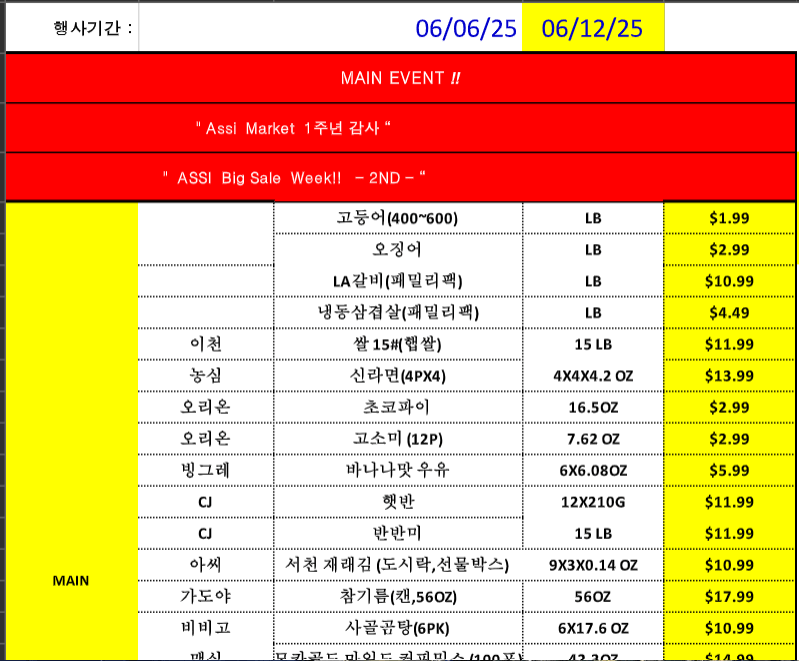 이번 주 세일에서는 고등어(400~600g, LB당 $1.99, 손질되지 않음), 오징어(LB당 $2.99, 손질되지 않음) 등 생선부의 신선한 수산물과 함께 야외 바비큐 및 모임에 적합한 LA갈비 패밀리팩(LB당 $10.99), 냉동 삼겹살 패밀리팩(LB당 $4.49) 등 육류 제품이 마련된다.