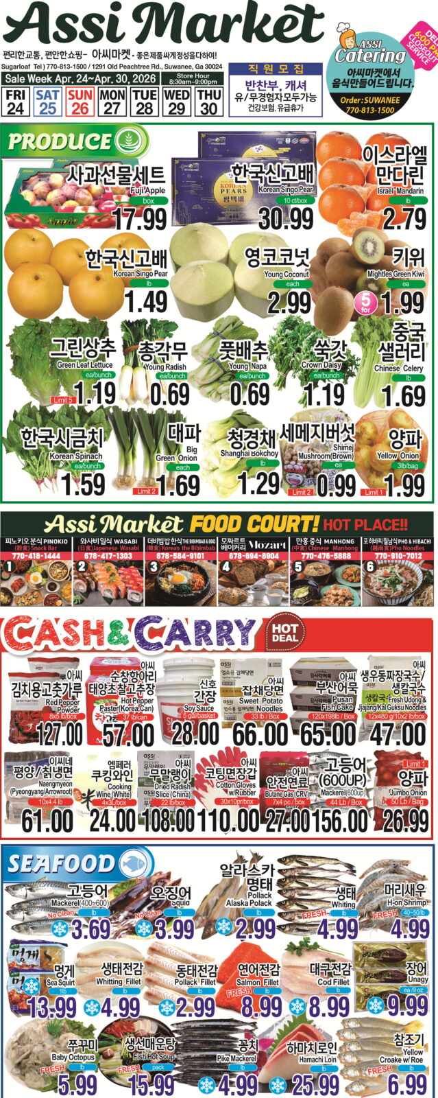 ASSI MARKET [아씨마켓] 한인 식품점 세일 정보 paul 2 hours ago 1 minute read 0 comments 아씨마켓(Assi Market) 조지아 지점의 4월 24일~4월 30일 세일 전단 정보를 요약해 드립니다. Post navigationPrevious: SK배터리, 지구의 날 맞아 도로 정화…5년째 지역사회 상생 실천Next: 아씨마켓, ‘제주의 봄 & 뜻밖의 한끼’ 특별전 개최Leave a Reply Cancel replyYour email address will not be published. Required fields are marked *Comment *Name * Email * Website Save my name, email, and website in this browser for the next time I comment. 관련기사 ASSI MARKET [아씨마켓] 한인 식품점 세일 정보 paul 6 days ago 4 ASSI MARKET [아씨마켓] 한인 식품점 세일 정보 paul 2 weeks ago 1 ASSI MARKET [아씨마켓] 한인 식품점 세일 정보 paul 3 weeks ago 0