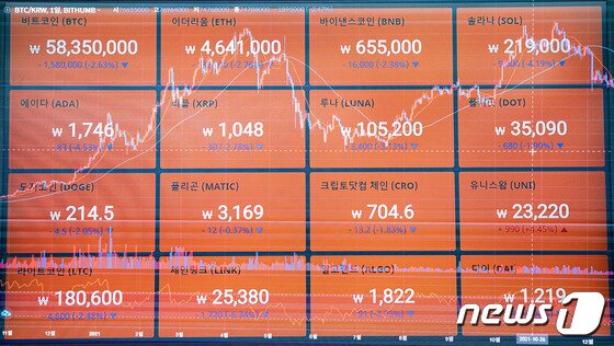 29일 오후 서울 서초구 빗썸 고객지원센터 전광판에 비트코인을 비롯한 암호화폐 시세가 표시돼 있다. |