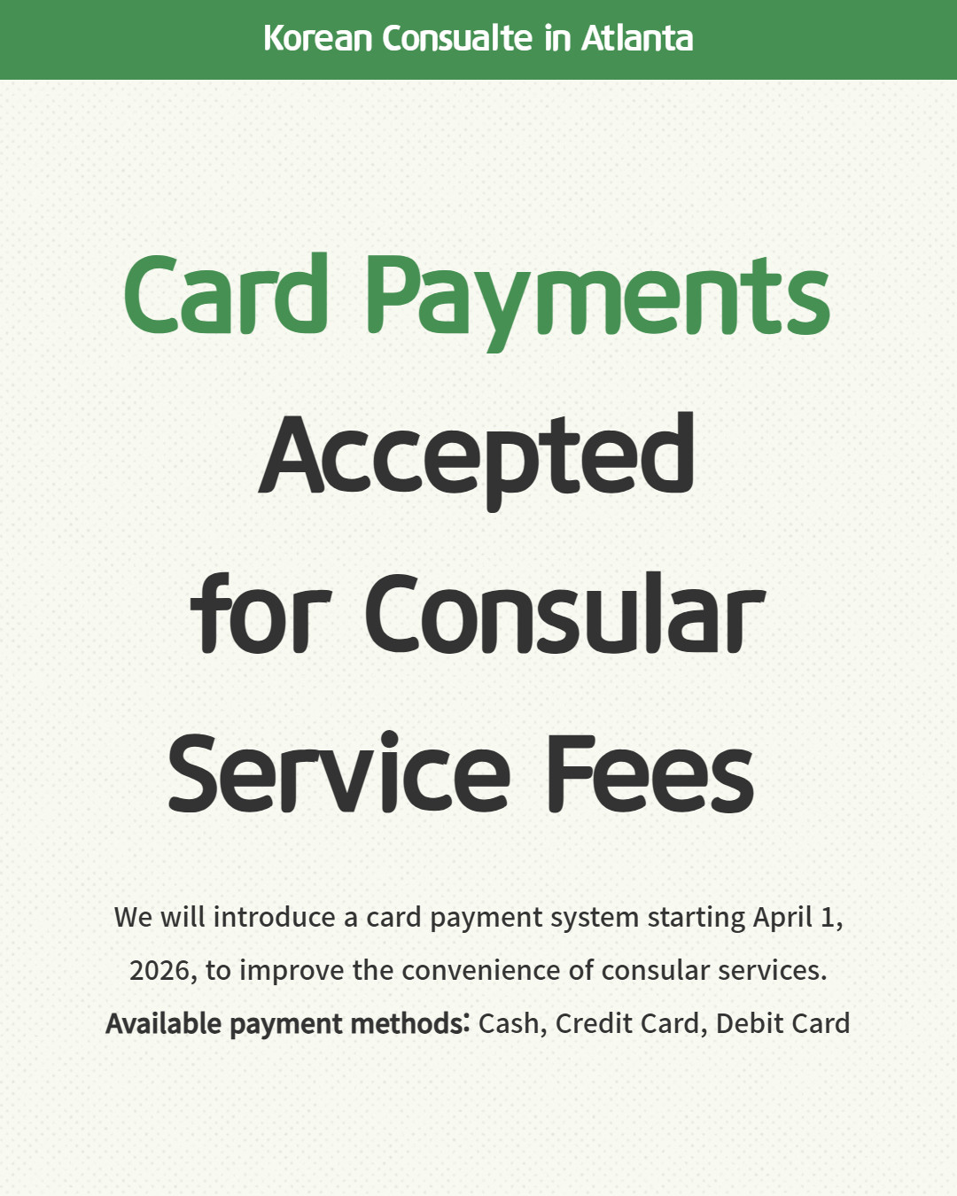 애틀랜타총영사관은 4월 1일부터 신용카드와 데빗카드 결제를 허용한다고 밝혔다. 그동안 민원 수수료는 현금으로만 납부해야 했으며, 이번 조치는 민원 편의 개선을 위한 조치로 설명됐다.