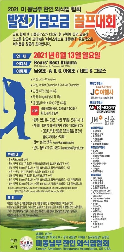 미 동남부한인외식업협회(회장 김종훈)가 주최하는 2021 발전기금 모금 골프대회(준비위원장 트로이 표)가 스와니 소재 ‘베어스 베스트 애틀랜타’골프장에서 열린다.