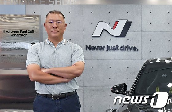 | 정 회장이 양재동 본사 사옥 현대차 고성능 브랜드 N 전시물 앞에서 포즈를 취하고 있다. (현대차그룹 제공) 2021.6.9/뉴스1 |