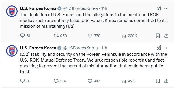 사령부는 이날 소셜미디어 X(구 트위터)를 통해 “한국 언론에서 보도된 내용은 전적으로 거짓이다. 주한미군은 한미상호방위조약에 따라 한반도의 안정과 안보를 유지하는 임무에 전념하고 있다”라고 적었다.