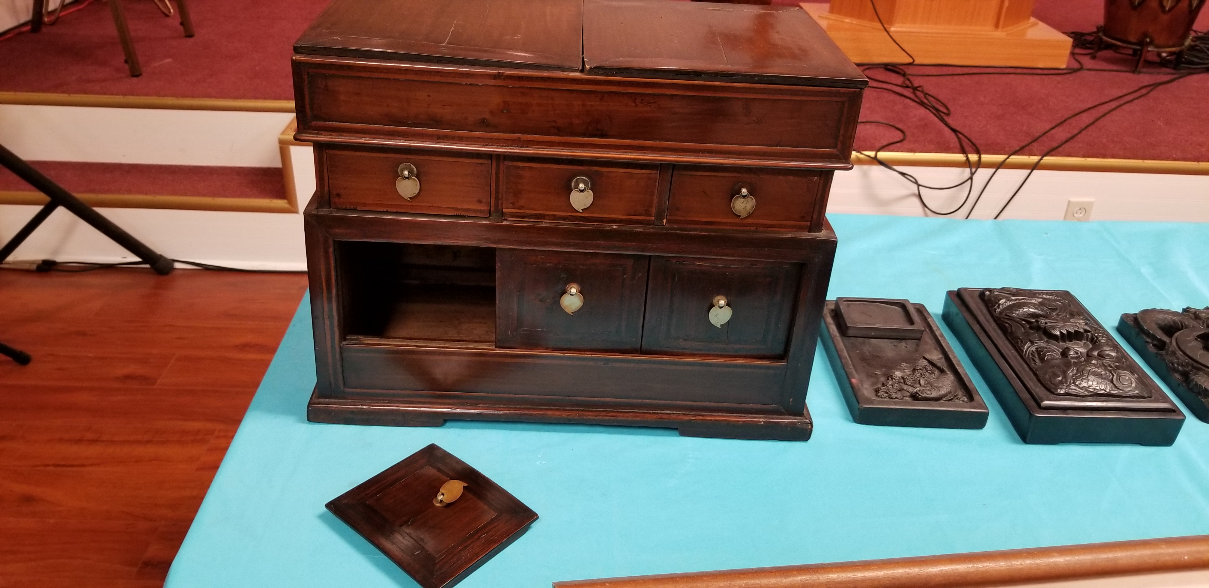 이날 행사에는 임군자 회원이 용벼루와 잉어벼루, 그리고 단양산 돌로 만든 풍뎅이벼루 등 6점의 벼루와 삼방문갑을 선보였다. 또한 이영자 회원은 자수와 100년된 상감백자, 이상희 회원은 ‘가야금을 타는 고구려 여인’ 그림, 추오희 회원은 들꽃으로 제작된 그림 2점 등 명품을 공개했다.
