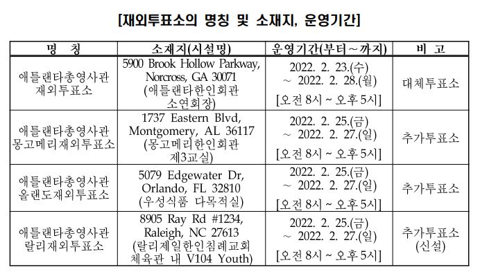 애틀랜타총영사관 재외선거관리위원회(위원장 김현경)는 31일 “오는 3월9일 실시되는 제20대 한국 대통령선거 재외투표소를 현행 3곳에서 4곳으로 늘리기로 했다”면서 “추가 투표소로는 노스캐롤라이나주 랄리시 랄리제일한인침례교회가 결정됐다”고 발표했다.