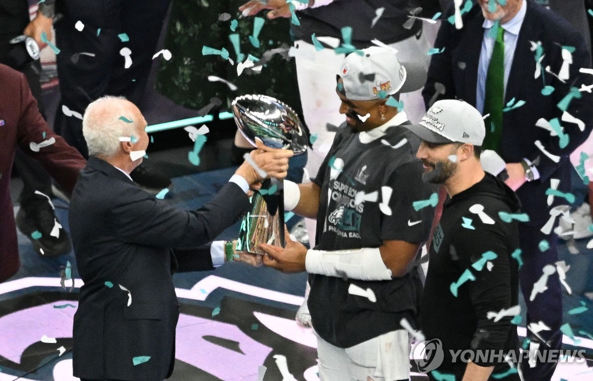 이날 경기에서 21개의 패스 가운데 17개를 성공시키고, 221패싱야드와 역대 슈퍼볼 최장인 72러싱야드를 기록한 필라델피아 쿼터백 허츠는 슈퍼볼 최우수선수(MVP)로 선정됐다.
