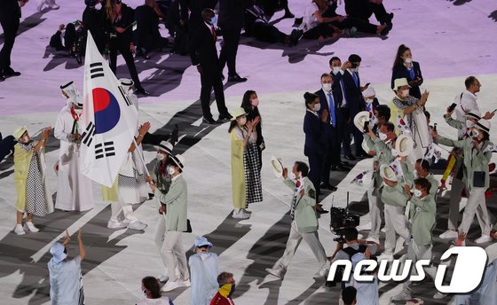 대한민국 도쿄올림픽 선수단이 23일 밤 일본 도쿄 국립경기장에서 열린 2020 도쿄올림픽 개막식에 입장하고 있다. 신종 코로나바이러스 감염증(코로나19) 팬데믹으로 인해 대회 1년 연기와 무관중 경기 등 사상 최악의 ‘불안한 스포츠 축제’ 2020 도쿄 하계올림픽은 이날 개막해 8월8일까지 17일간의 열전에 돌입한다. 2021.7.23/뉴스1 © News1 송원영 기자