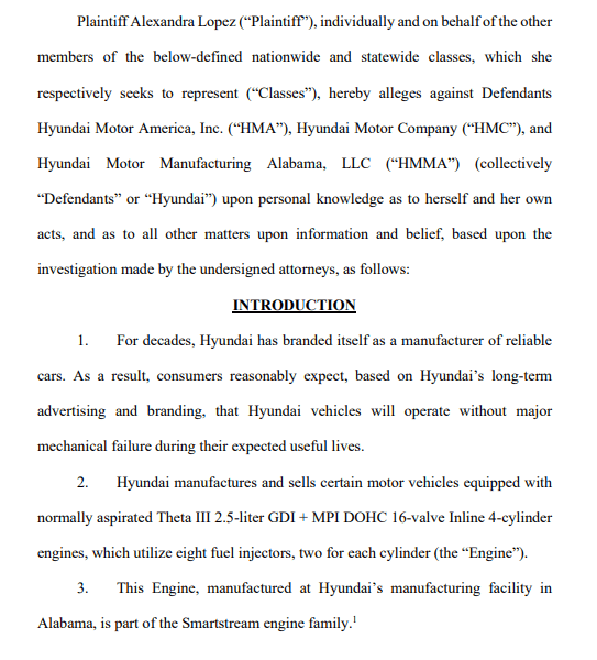 조지아주 알파레타에 거주하는 소비자 알렉산드라 로페즈는 자신이 구매한 2022년형 투싼 차량에서 반복적으로 연료 인젝터 결함이 발생했다고 주장하며 현대자동차 및 미국법인을 상대로 앨라배마 중부 연방법원에 집단소송 승인을 신청했다.