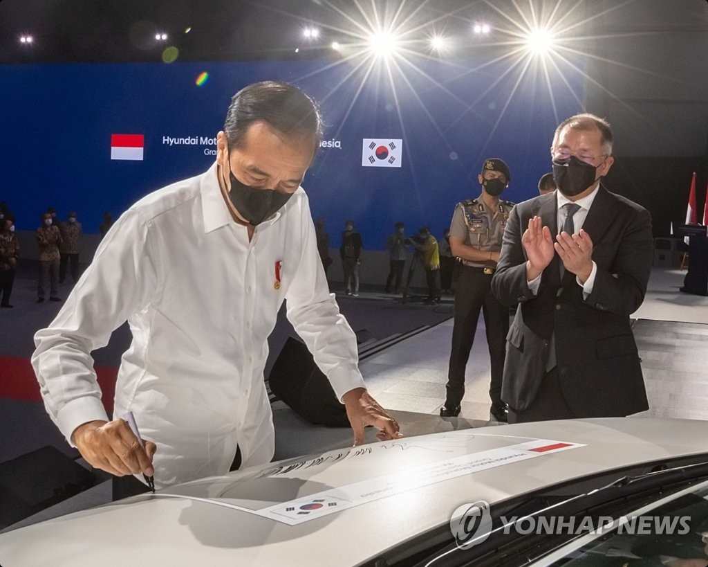 조코 위도도 인도네시아 대통령(왼쪽)이 2022년 3월 16일 인도네시아 브카시 현대차 인도네시아공장 준공식에서 아이오닉5에 서명하고 있다. 오른쪽은 박수치는 정의선 현대차그룹 회장.
