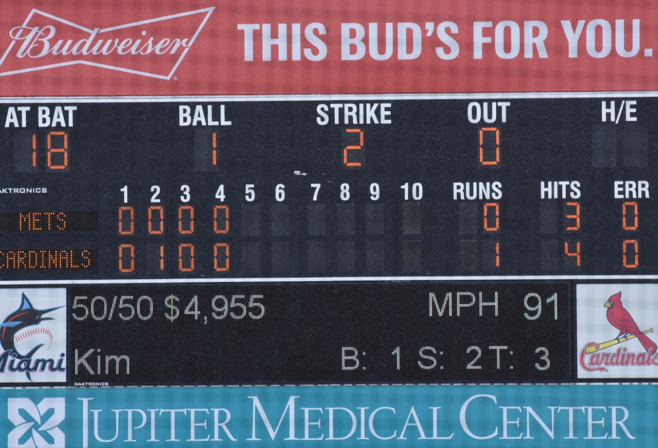 김광현은 22일 플로리다주 주피터 로저 딘 시보레 스타디움에서 열린 2020 메이저리그 시범경기 뉴욕 메츠전에 5회초 구원 등판해 1이닝 1볼넷 2탈삼진 무실점을 기록했다. 투구수는 19개였고 그중 스트라이크가 14개였다. 최고 구속은 92.1마일까지 나왔다.
