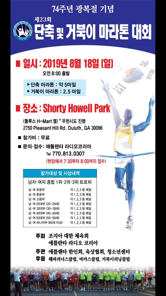 [화보] 광복절 기념 마라톤 대회 admin 6 years ago 조지아 대한체육회(회장 권요한)가 주최한 제23회 광복절 기념 단축 및 거북이 마라톤 대회가 둘루스 쇼티하웰 공원에서 18일 열렸다. 한인 100여명이 참가한 가운데 단축 마라톤(5마일), 거북이 마라톤(2.5마일)으로 나뉘어 진행됐으며 남자부 1위 유성은 2위:김권 3위: 백현수, 여자부 1위 김현숙 2위 박순경 3위 심미애씨 등의 수상자를 배출했다. 대회 이모저모를 화보로 소개한다. Share this: Click to print (Opens in new window) Print Click to share on Facebook (Opens in new window) Facebook Click to share on X (Opens in new window) X Click to share on LinkedIn (Opens in new window) LinkedIn Click to share on Pinterest (Opens in new window) Pinterest Click to share on Telegram (Opens in new window) Telegram 언택트 거북이 마라톤 대회 열린다Date06/12/2021In relation toAtlanta6세 어린이 마라톤 완주…’아동학대’ 논란Date05/07/2022In relation toK-News조지아 98세 할머니, 5㎞ 달리기 1시간내 완주Date03/10/2023In relation toAtlanta