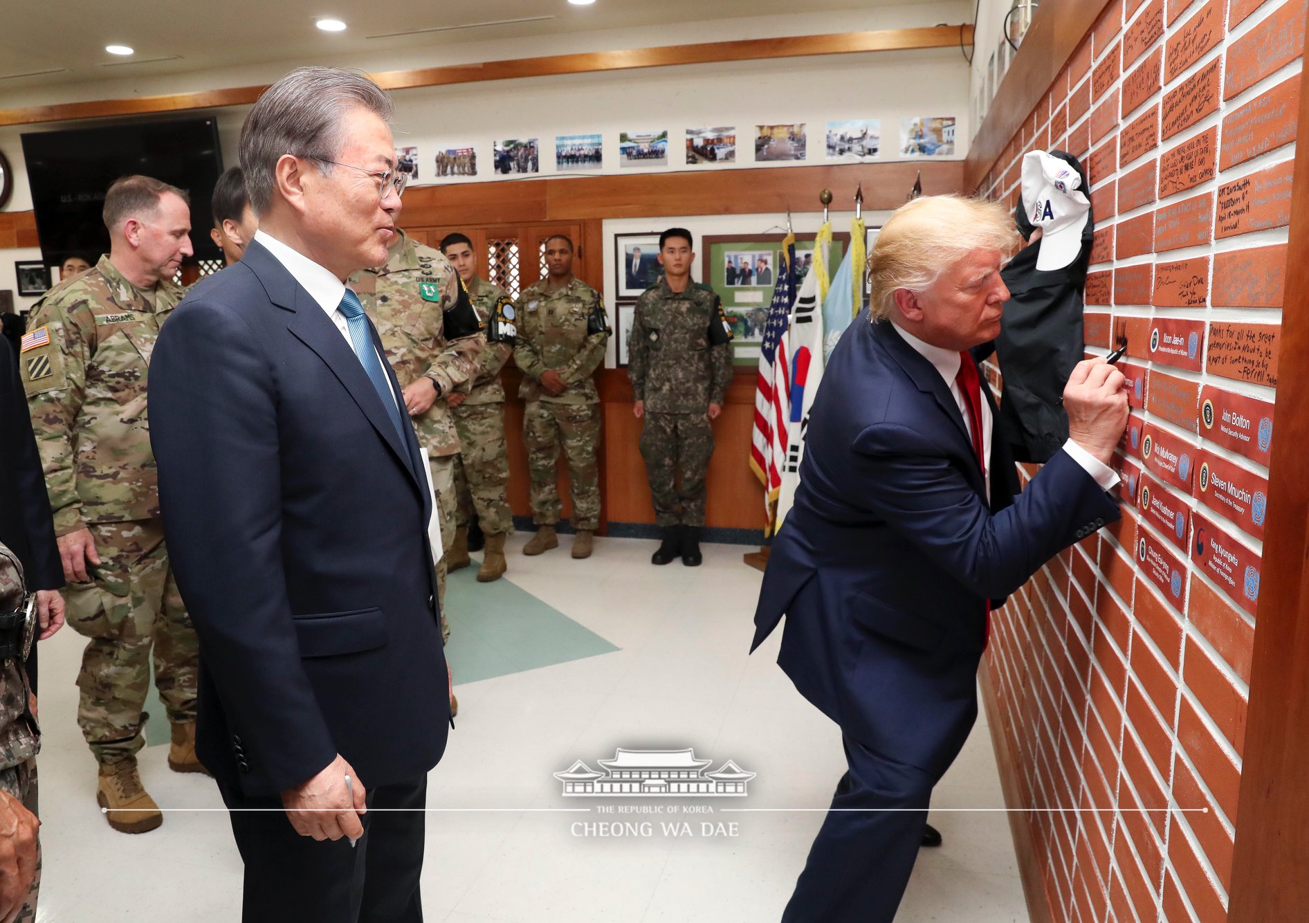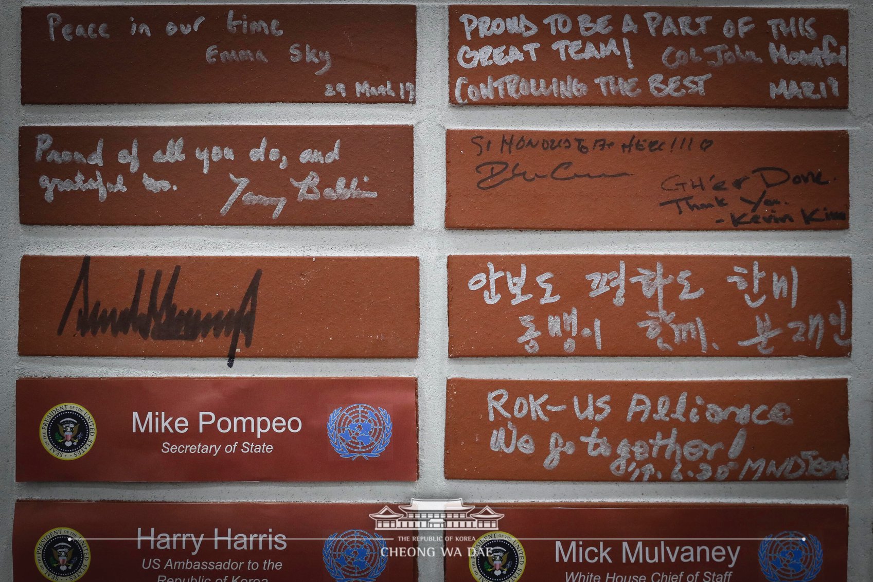 트럼프 대통령은 검은색 사인을, 문재인 대통령은 그 오른쪽에 ‘안보도 평화도 한미 동맹이 함께’라고 적어넣었다.