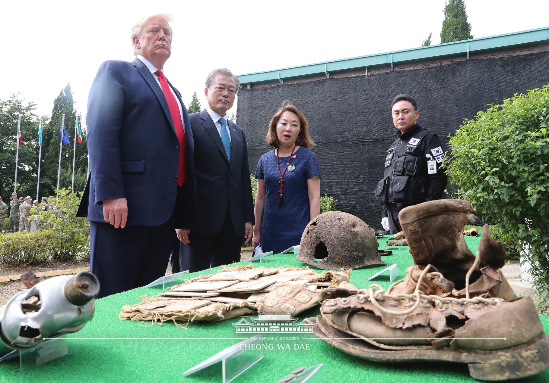 비무장지대에서 발굴된 6.25 관련 유품을 둘러보는 한미정상