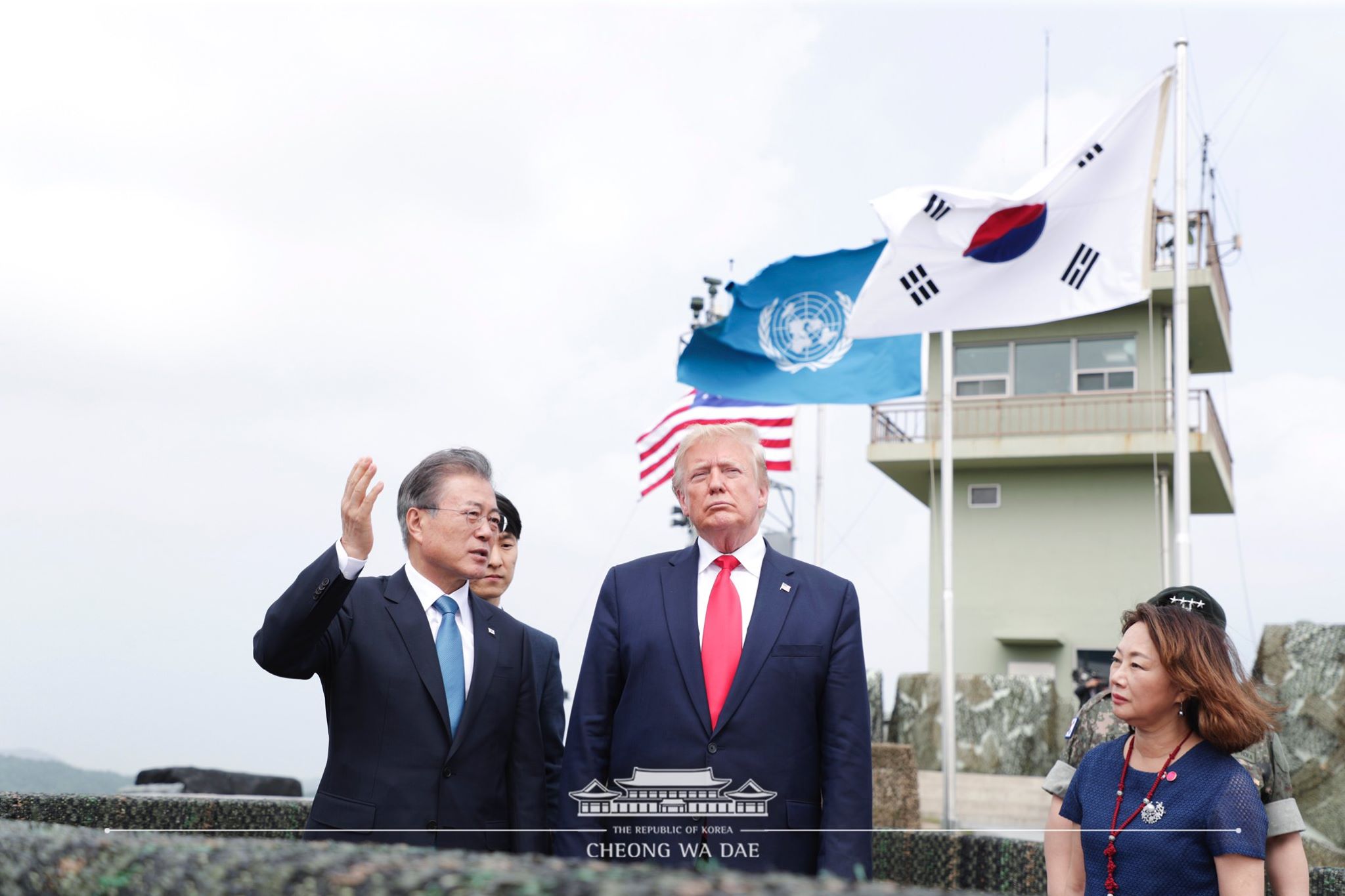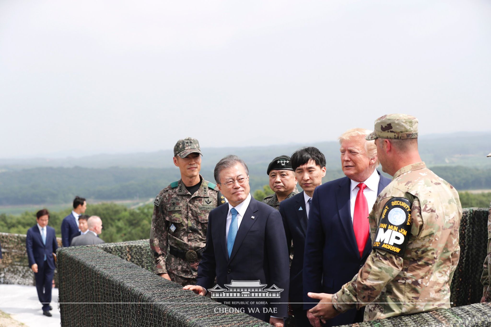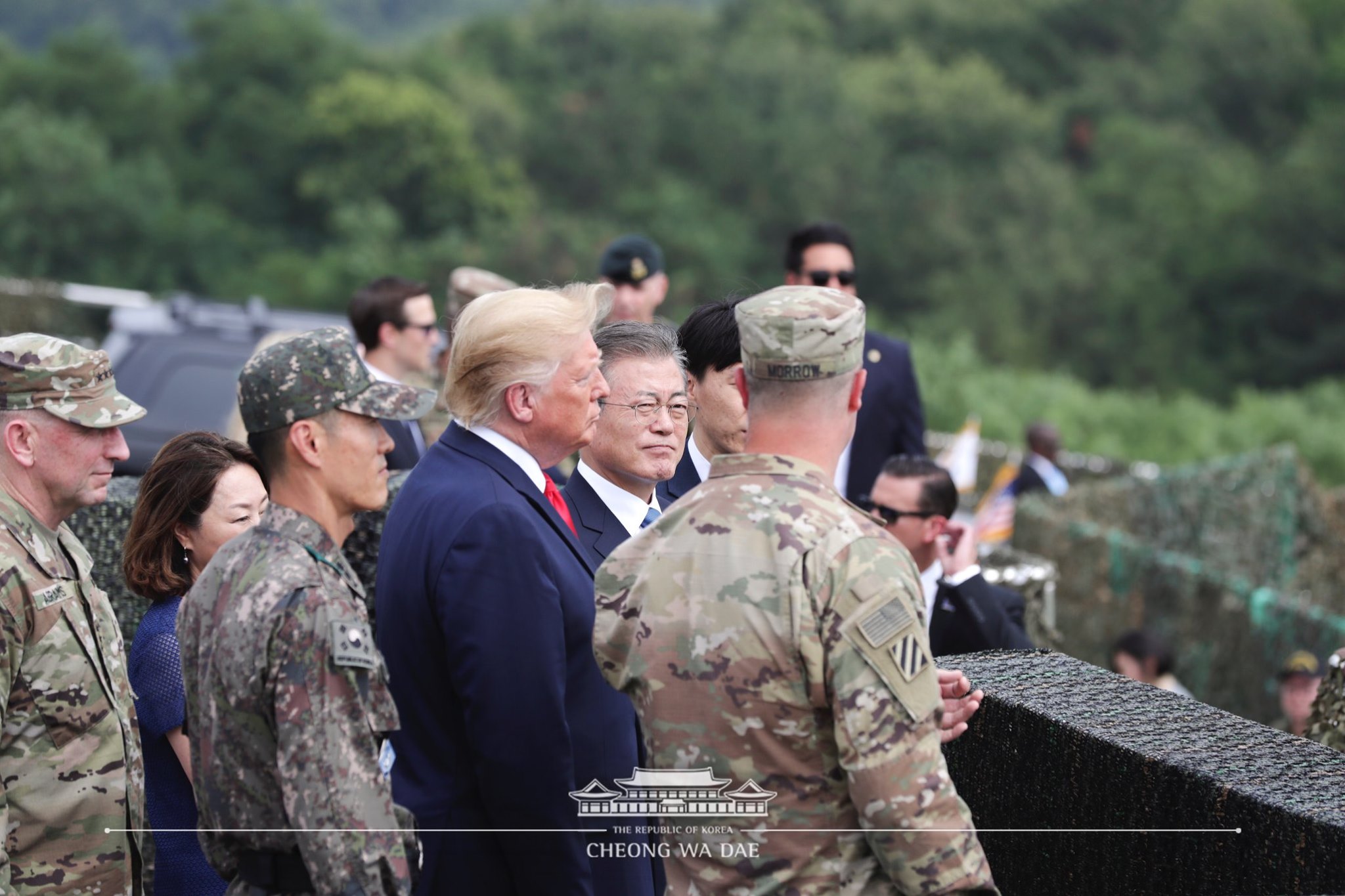 DMZ 오울렛 초소를 방문해 설명을 듣고 있는 문재인 대통령과 트럼프 대통령.
