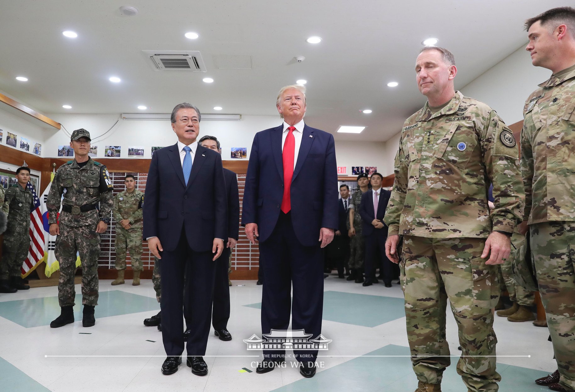 DMZ 오울렛 초소를 방문해 설명을 듣고 있는 문재인 대통령과 트럼프 대통령.