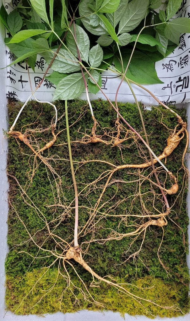 이 가족 산삼은 짙은 황색에 형태가 빼어나며 뇌두(산삼 머리) 부분이 세밀하다.