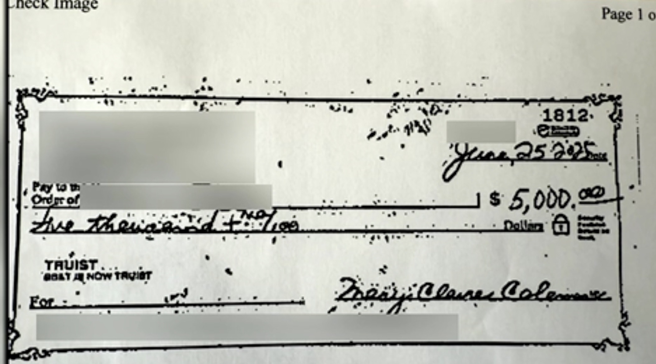 조지아주 둘루스에 거주하는 전직 주 하원의원이자 교육자인 브룩스 콜먼(Brooks Coleman) 부부가 세금 납부를 위해 우편으로 보낸 수표가 도난당해 총 2만달러의 피해를 입었다.경찰에 따르면, 범인들은 이 수표를 세탁(washing)해 위조 수표 3장으로 변조하고 현금화했다.