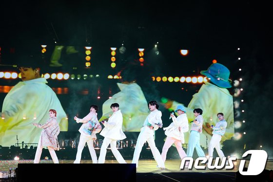 | 그룹 방탄소년단(BTS)이 28일 로스앤젤레스 소파이 스타디움에서 열린 ‘BTS 퍼미션 투 댄스 온 스테이지 – LA'(BTS PERMISSION TO DANCE ON STAGE – LA) 공연을 갖고 있다. (빅히트뮤직 제공) |