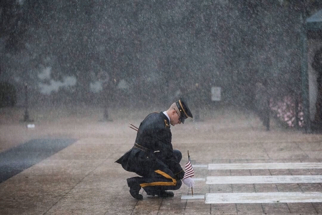 지난 23일 메모리얼 데이를 앞두고 참배객이 몰려들던 버지니아주 알링턴 국립묘지에 갑자기 폭우와 함께 강풍이 불었닥쳤다. 참배객들과 다른 관리직원들은 황급히 실내로 대피했지만 한 병사는 끝까지 비바람속에서 한 묘지앞을 지켰다.